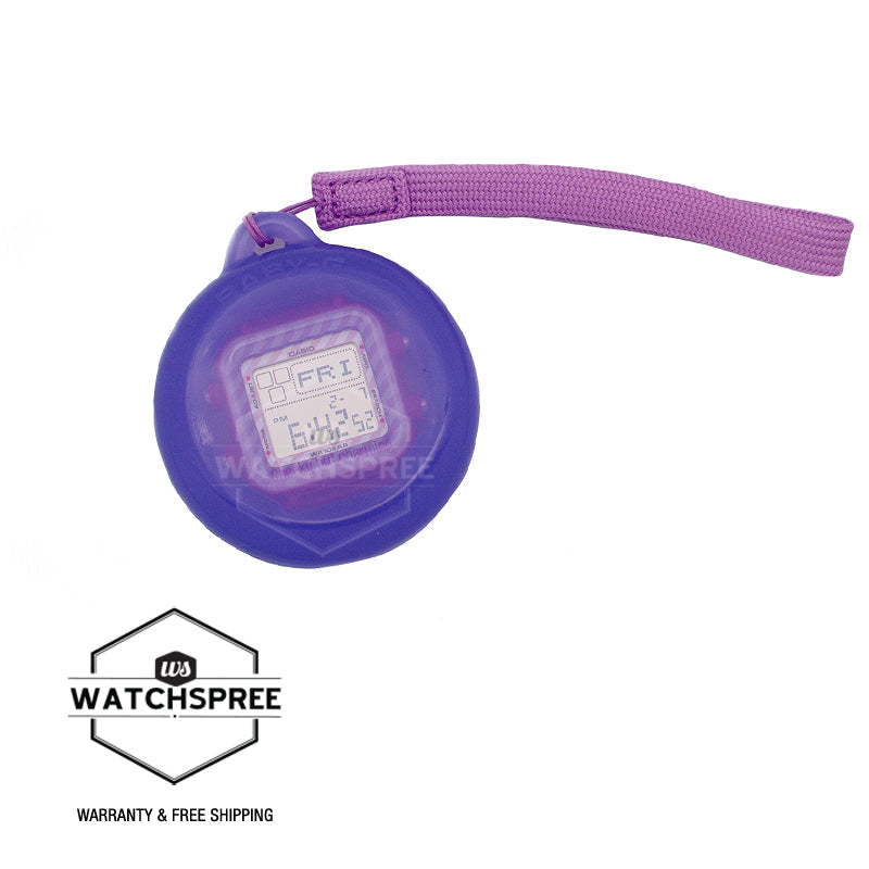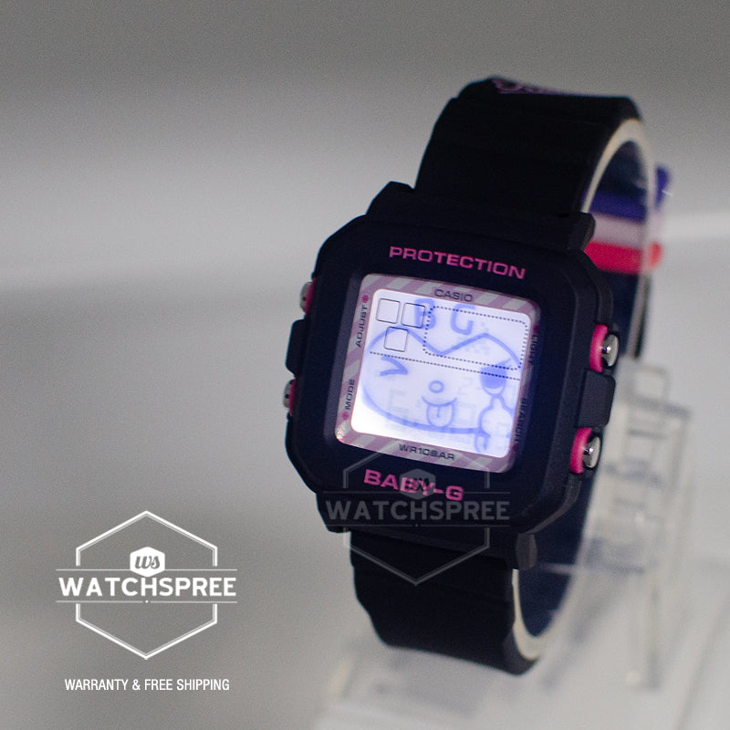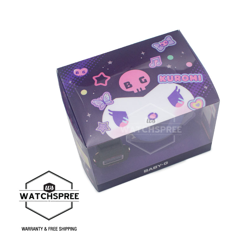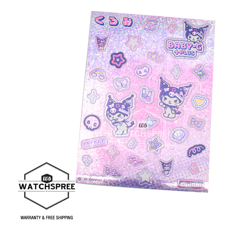 The wristwatch features a black base color with purple and pink accents, whose playful design showcases KUROMI with the BABY-G initials "BG" initials on her forehead. Turning on the watchƒ??s backlight causes KUROMIƒ??s adorable face to appear on the display. Removing the watch from the strap reveals a cute image of KUROMI looking back over her shoulder. The case back is engraved with a special KUROMI clock face to mark BABY-G's 30th anniversary. The special pendant-like holder is inspired by KUROMI and comes in a purple color. You can remove the watch case from its bezel and insert it into the holder, which transforms the watch into a charming accessory that can be attached to a bag or worn as a charm. The strap of this model comes with three KUROMI-color rings along with three additional rings that you can combine to personalize the look of your wristwatch to match your mood or outfit. It also includes original stickers that you can affix to the holder to create your very own KUROMI design.