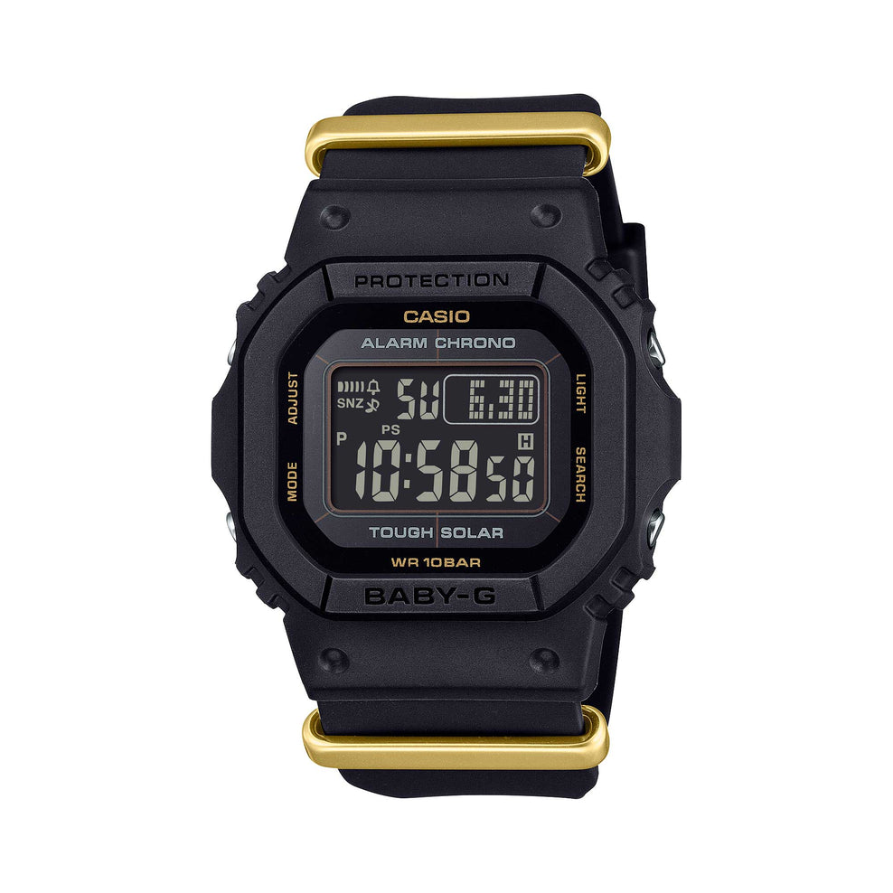 Based on the BGD-S565, this compact solar-powered timepiece delivers a great fit for slimmer wrists. The black and gold color scheme evokes the first flicker of light, that spark of innovative craftsmanship, where the creation of new value begins.