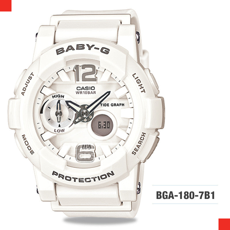 Feature-wise, the BGA-180 is the first analog model in BABY-G line up to include a TIDE GRAPH feature. In the Timekeeping Mode, the small hand of the dial at 9 o'clock normally indicates current tide information. Each press of the button at 4 o'clock in the Timekeeping Mode advances the tide information indicate by the dial hand by one hour.
