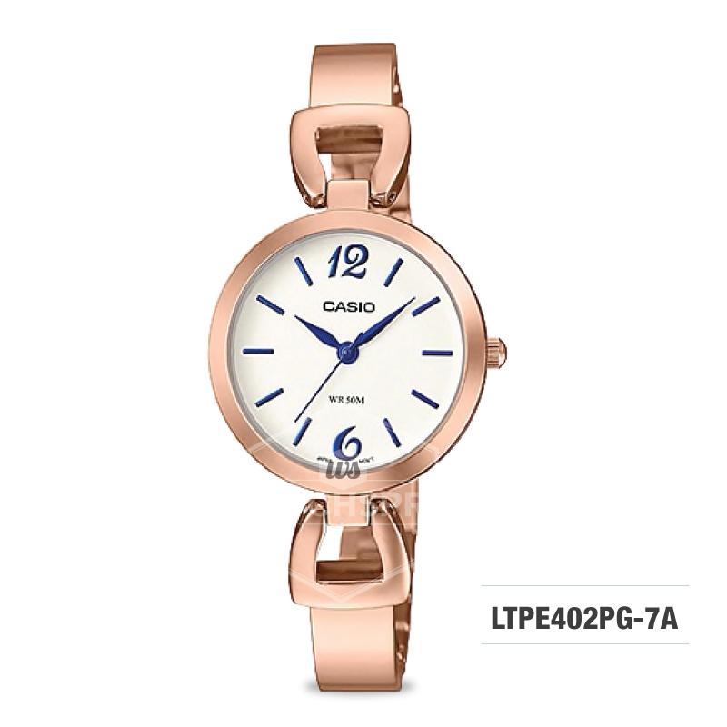 Casio Ladies' Standard Analog Pink Gold Ion Plated Band Watch LTPE402PG-7A LTP-E402PG-7A Watchspree