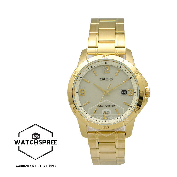 Casio Men's Standard Analog Solar-Powered Gold Ion Plated Stainless Steel Band Watch MTPVS02G-9A Watchspree