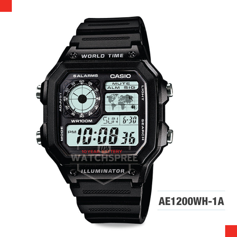 The AE1200 series is known for its multi-mission LCD and 10 year battery. The watch's large square case design provides a wealth of easy-to-read information, such as World Time Map and Analog LC Display. Additional features include a 1/100th second stopwatch, 24 hour countdown timer and 5 alarms.