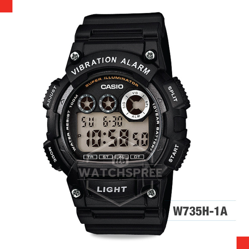With the rugged looking W735 series, Casio re-introduces the vibration alarm, a function that is useful where discretion is required or in loud environments where audible alarm signals could be missed. The watch also includes a 10 year battery, is 100 meter water resistant and has a high-brightness LED light. All this and more additional functionality, provide a great value for those who work hard and play harder.